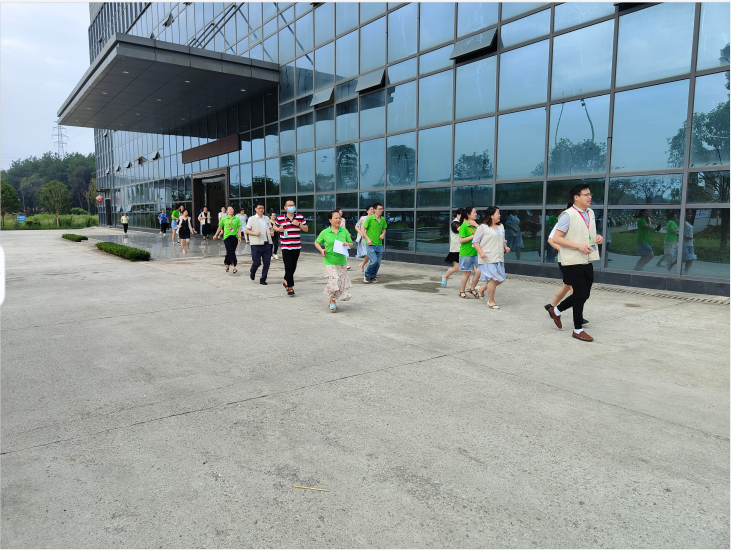 应急疏散演习中,随着该公司大楼响起的警报声,公司人员有序的按消防